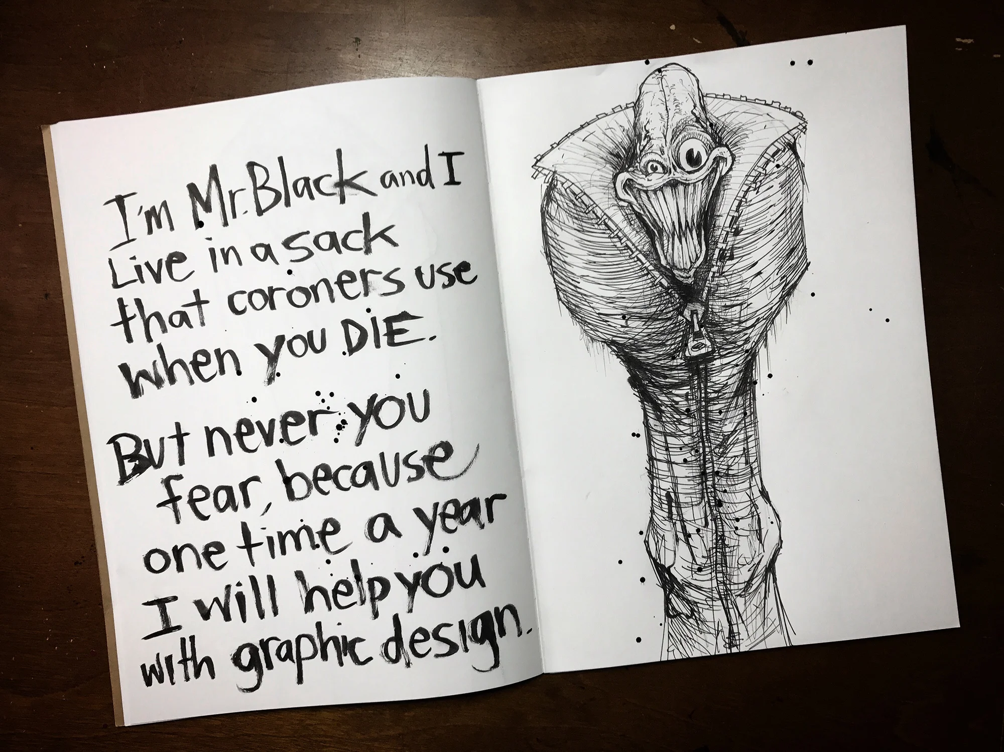 His name is MR. BLACK. And he lives…in a sack. Or a body bag. That’s all I know about him, aside from the fact that he’s an excellent designer, he speaks mostly in rhymes, and I’m 99% positive he’s a ghost of some sort.